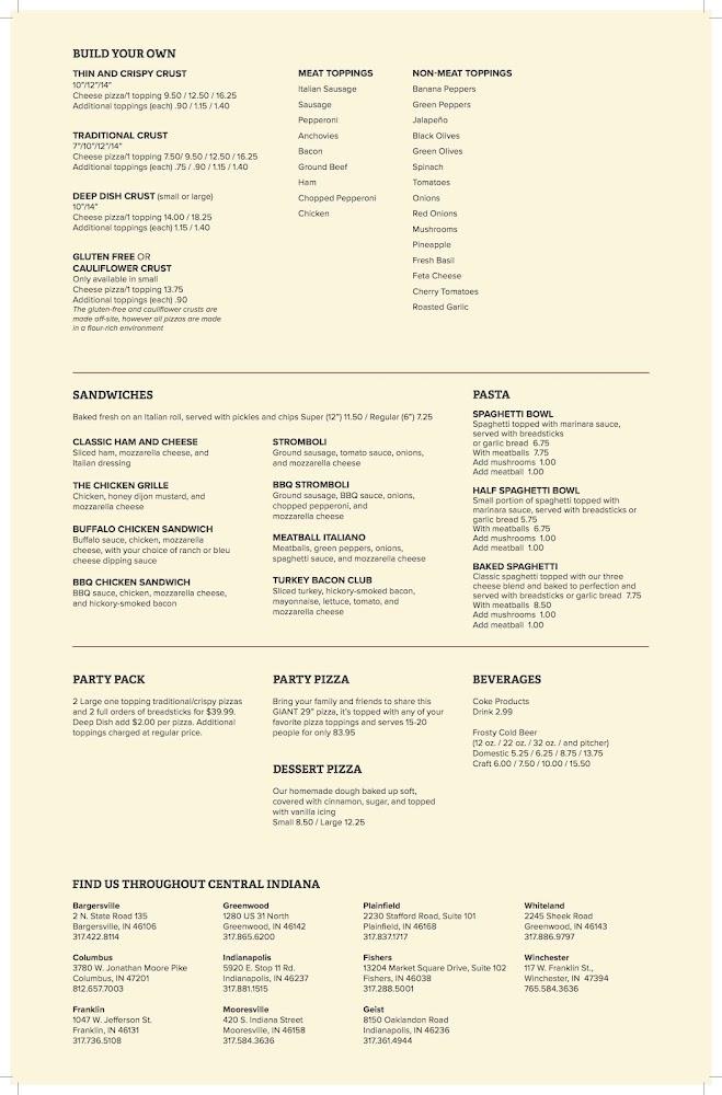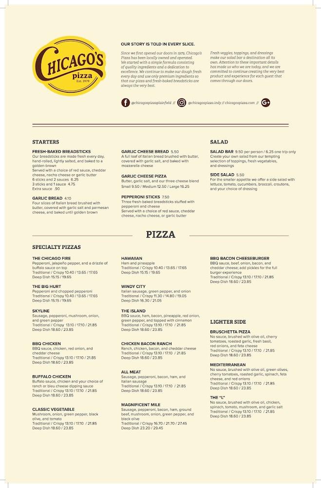 Welcome to Chicago's Pizza Plainfield, where quality and freshness have been our hallmark since 1979! Located at 2230 Stafford Rd, we pride ourselves on offering a delicious range of pizza options including thin-n-crispy, traditional, deep dish, and gluten-free crusts. Enjoy our hand-rolled breadsticks and a lively lunch buffet from Monday to Friday, featuring an endless selection of pizzas, dessert, and a fresh salad bar. Whether you're dining in, ordering takeout, or taking advantage of our delivery services, we ensure a delightful experience for everyone. Join us and discover why we're a local favorite for family meals and gatherings!